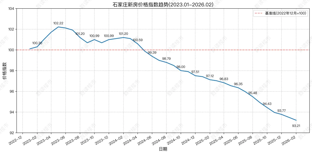 以2022年12月价格为基准(100),2023年1月至2026年2月石家庄新房市场价格变化走势如下图所示:石家庄新房价格指数在 2023 年 1 月至 2026 年 2 月期间呈现先小幅上扬、后持续下行的整体趋势,市场价格从阶段性回暖逐步转向持续走弱,截至 2026 年 2 月,价格指数已降至93.21,较基准值下跌约6.79%。