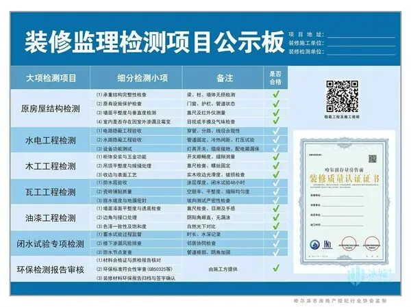 记者在装修监理检测项目公示板样板上看到,除包括项目地址、装修施工单位和装修检测单位等,其检测的内容主要涉及原房屋结构检测、水电工程检测、水工工程检测、瓦工工程检测、闭水试验专项检测和环保检测报告审核等七大项,具体则包括承重结构完整性检查和环保标准符合性审查等22个细分检测小项。