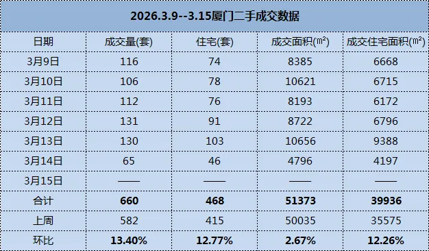 上周厦门二手房成交660套,其中,二手住宅成交468套,环比上涨12.77%。二手房成交面积51373㎡,其中二手住宅成交面积为39936㎡,环比上涨12.26%。