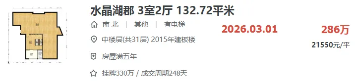 像水晶湖郡这套3房房源,成交总价286万,成交单价21550元/㎡。