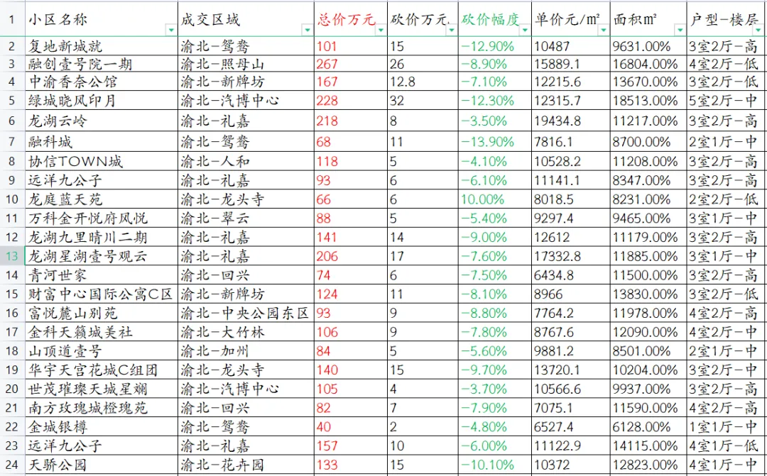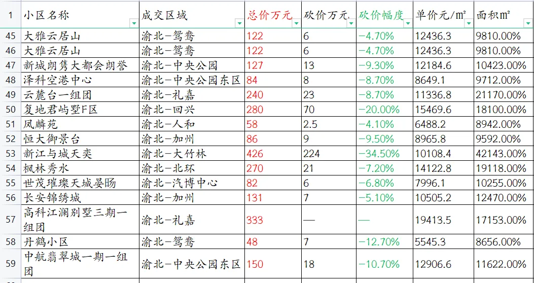 【重庆楼市深度观察】渝北区本次统计共58套房源成交信息。