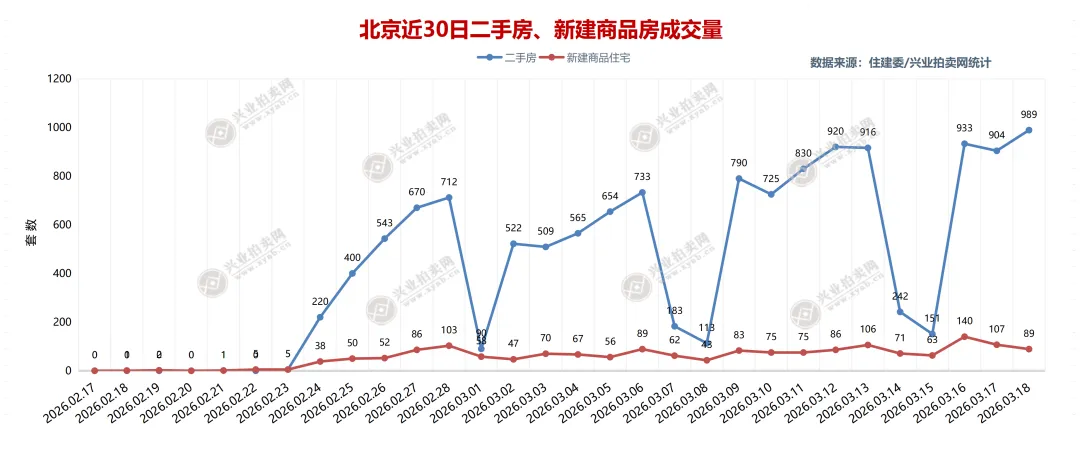 2026年3月18日北京二手房网签成交989套,本月累计网签成交10769套;其中住宅网签成交914套,本月住宅累计网签成交9783套,北京新建商品住宅成交89套,本月累计成交1387套。