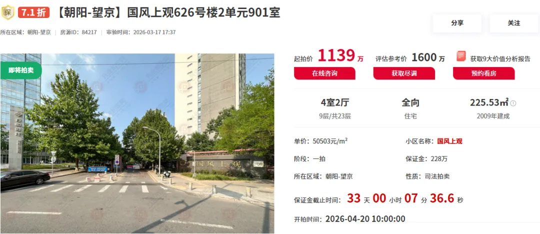 本次拍卖房产为国风上观626号楼2单元901室的住宅,建筑面积225.53平米,4室2厅格局,全向通透,中楼层视野与居住舒适度俱佳。此次挂拍价为1139万,评估参考价约1600万,相当于7.1折起拍,定于2026年04月20日10时开拍,房屋相关信息已调查完成,可联系我们获取尽调报告及预约看房!