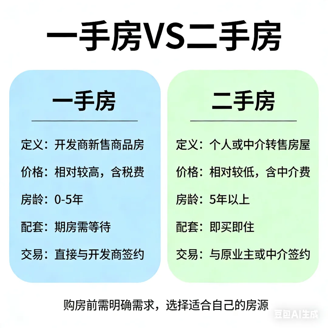 - 一手房:单价通常更高,税费少(契税+维修基金)