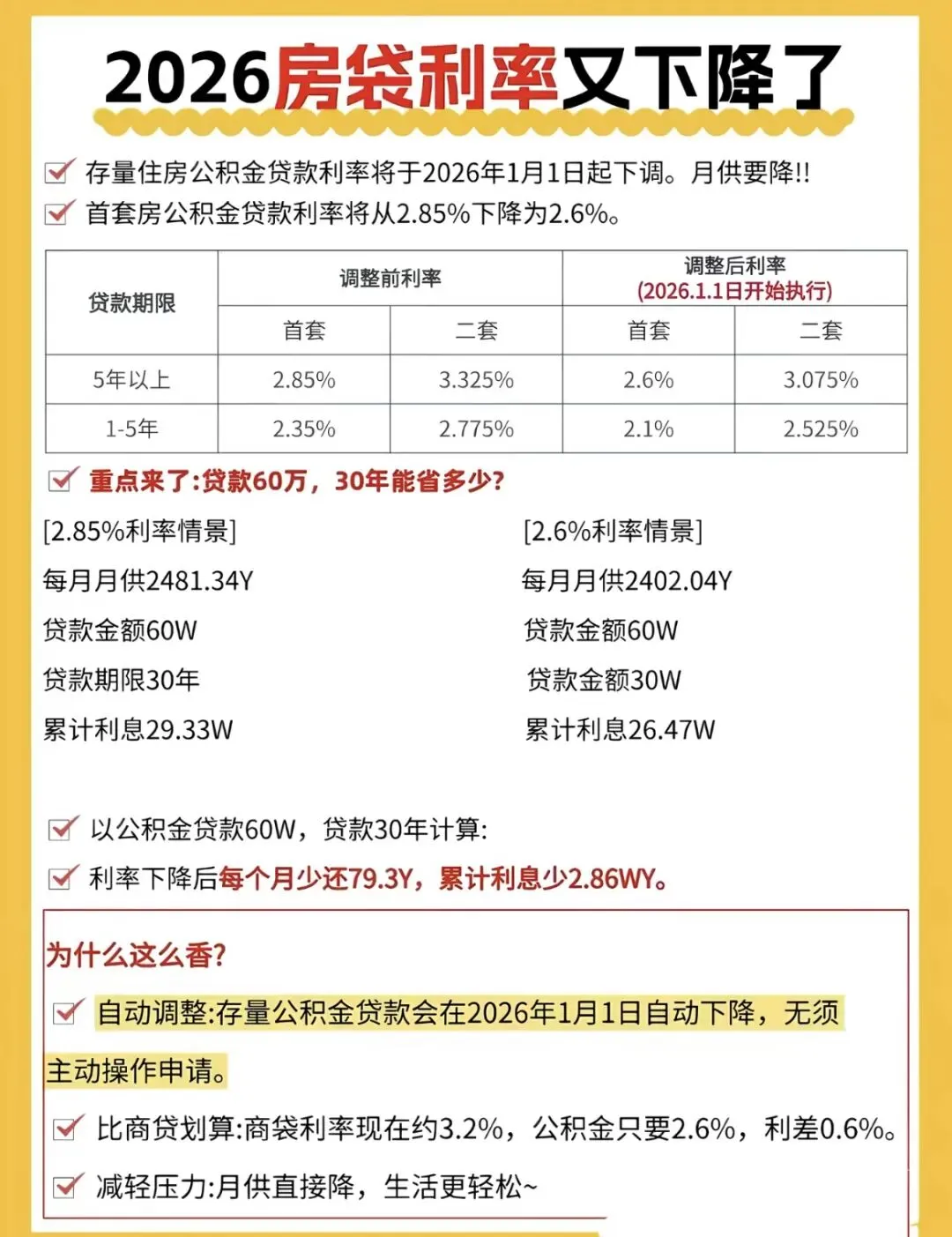 央行进一步放宽房贷利率下限,明确各城市可因城施策动态调整首套房贷利率政策。商业银行在风险可控前提下拥有更大自主权,多地首套房贷利率已降至3.4%—3.5%区间,部分重点城市甚至出现“3.2%”的历史新低。公积金贷款利率同步下调,5年以上低至2.6%,多子女家庭、人才群体可享更高额度,部分城市家庭贷款上限提升至160万。以100万商业贷款30年等额本息计算,月供减少约432元,总利息节省超15.6万元;公积金贷款月供减少约278元,总利息节省超10万元。实实在在的“省钱账本”显著减轻还贷压力,尤其对年轻家庭形成有力支持。