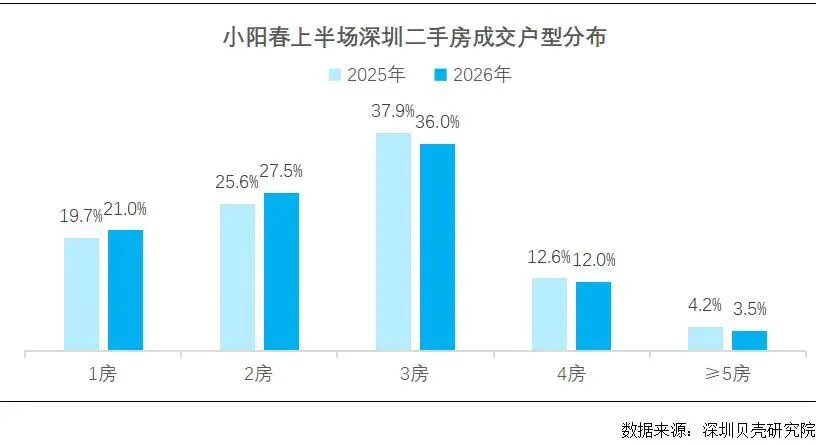 深圳贝壳研究院获悉,2026年楼市小阳春如期而至,且表现明显好于去年同期。春节假期复工后的22天里,贝壳深圳合作门店二手房签约量较去年同期增长19%,创近五年同期新高。具体来看,成交户型方面,一房、两房的小户型较去年更受市场青睐,成交占比上升,成为本轮成交量回升的重要支撑。据统计,今年两房成交占比为27.5%,同比扩大1.9%;一房成交占比为21%,同比扩大1.3%。此外,优质学区房及中大户型房源自本周起成交明显增多,预计将成为本轮小阳春下半场的成交主力。深圳最新按揭贷款利率