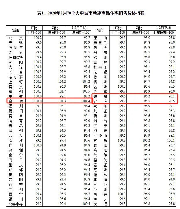 国家统计局数据显示,2月份合肥新建商品住宅销售价格指数环比持平,同比增长1.3%,1-2月平均增长1.4%。