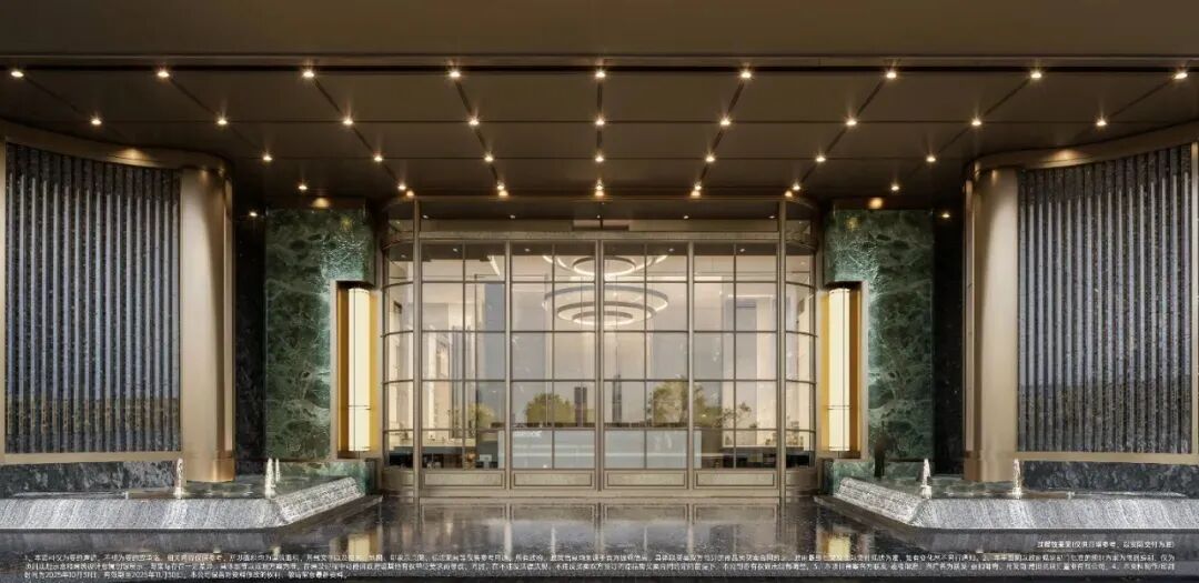 同样做到这一点的,还有联发嘉和御府,当购房者站在气势恢宏、有着约13米高、约58米宽的双层奢阔门庭之前,对面是中央精致超白玻璃电动移门构筑视觉焦点,两侧镶嵌铂金钻、普拉达绿奢石景墙与恢弘前场环抱相迎——这就是对项目最好的注解。
