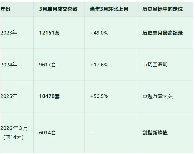 这一数据环比2月同期涨幅高达113%,同比2025年3月同期也上涨了18.4%。更值得注意的是微观市场的热度:仅3月14日单日成交570套,上周末更是轻松破千套。