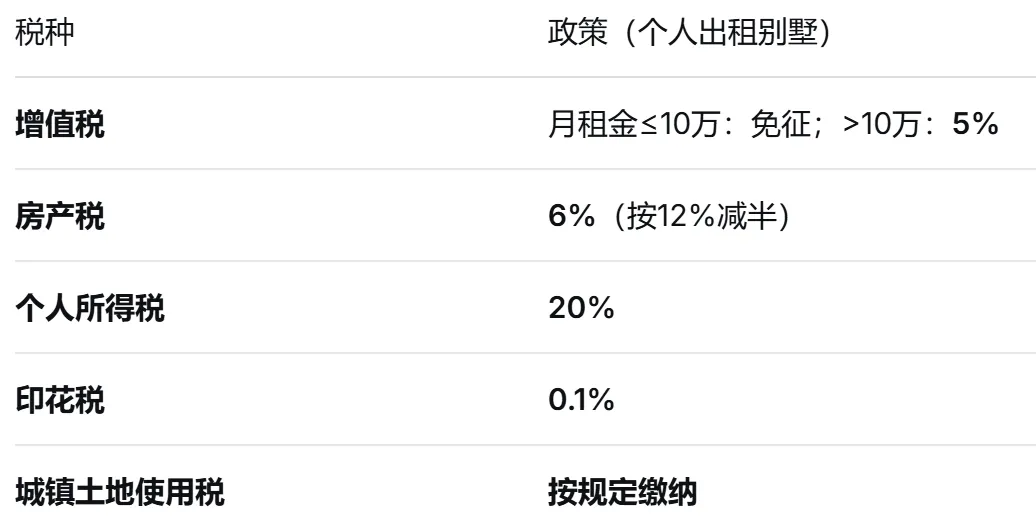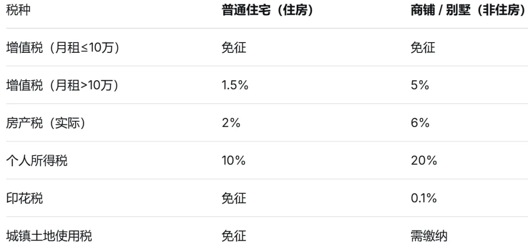 首先要明确一点:我国并没有“租赁税”这个单一税种。大家常说的“租房税”,其实是出租房屋涉及到的增值税、房产税、个人所得税等多个税种的统称。而且,普通住宅、商铺、别墅的税费标准完全不同——别墅通常被税务部门归为“非住房”,税费标准与商铺看齐,比普通住宅高出一截。