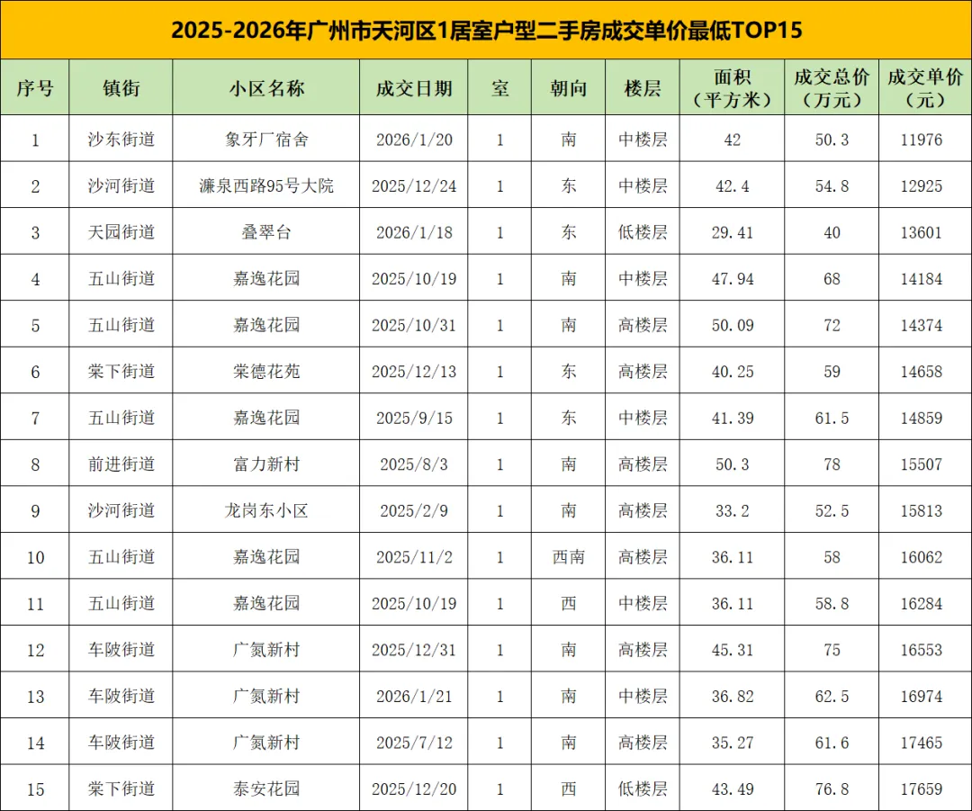 2025年以来,广州市天河区1居室户型成交单价最低的15套二手房,普遍具有“老、小、旧”的特点:面积多在30-50平方米之间,成交总价集中在50万-80万元区间,成交单价集中在1.2万-1.8万元/㎡。