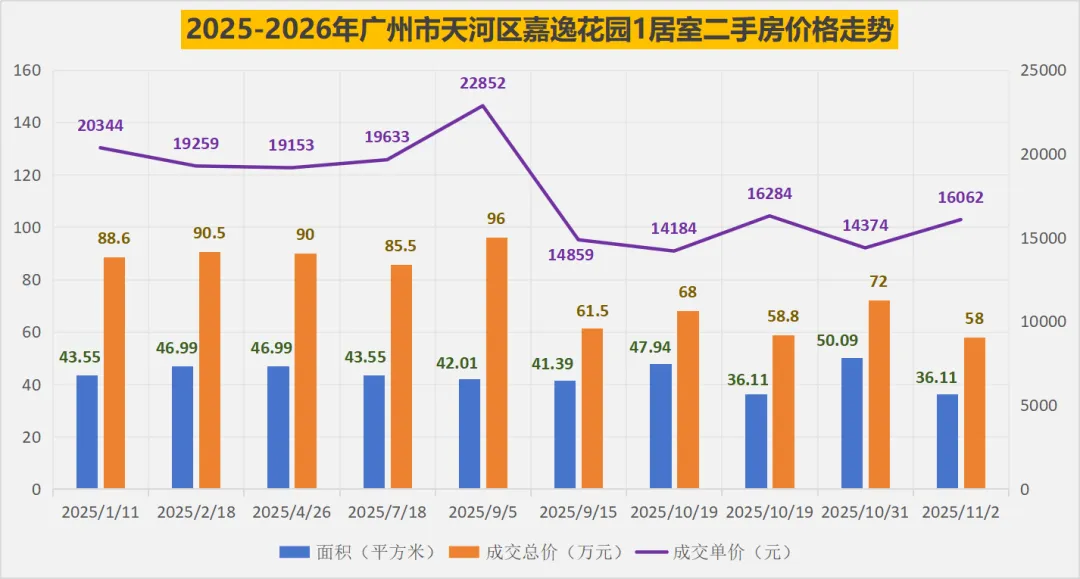 2025年以来,嘉逸花园1居室二手房的成交单价,在2025年9月初冲高至22852元/㎡后断崖式下跌,随后稳定在1.4万-1.6万元区间震荡。
