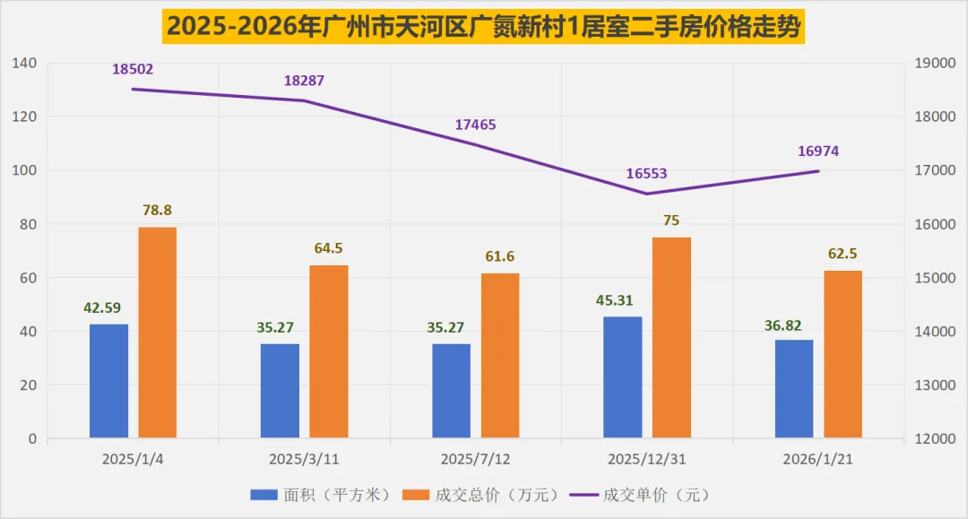 2025年以来,广氮新村1居室二手房的成交单价呈先降后稳的温和波动趋势,价格高点出现在 2025 年初(18502 元 /㎡),对应大面积(42.59㎡)、高楼层房源;2025 年下半年受楼龄、户型面积差异影响,单价逐步下探,2025 年底至 2026 年初稳定在 1.65-1.7 万元 /㎡区间。可以看出,小面积、中楼层的二手房更易形成相对低价。