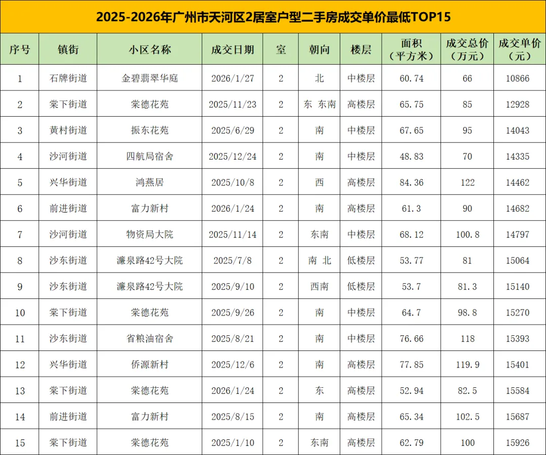 2025年以来,广州市天河区2居室户型成交单价最低的15套二手房,呈现出老小区主导、刚需属性突出、区域分布集中的特征,面积多在50-70㎡,成交总价集中在66-122万元,单价区间在1.1-1.6万元/㎡。