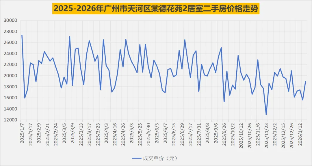 2025年以来,棠德花苑2居室二手房的成交单价,呈现先升后降、整体下行的趋势,没有明显的单边上涨或下跌,更多是受具体房源的楼层、朝向、装修以及市场短期供需影响而产生的个案价格波动,其中2025年初成交单价约2.7万元/㎡,此后波动下滑,至2026年1月已降至约1.6万元/㎡,成交单价主要集中在1.5万至2.5万元/平方米区间,成交总价集中在100-170万元,面积多为55-65㎡。