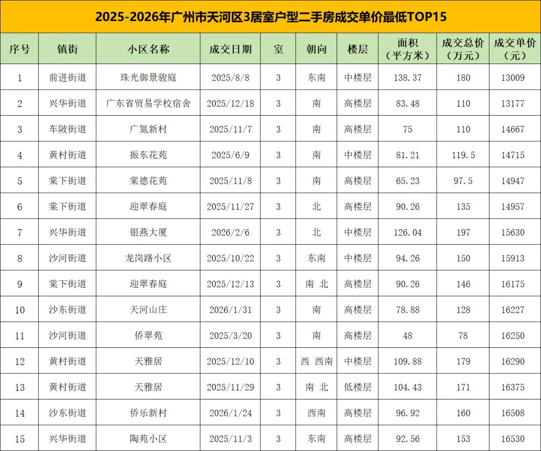 2025年以来,广州市天河区3居室户型成交单价最低的15套二手房,呈现出老小区主导、刚需改善属性突出、区域分布分散的特征,面积跨度较大,从48㎡到138.37㎡不等,成交总价集中在78-197万元,单价区间在1.3-1.7万元/㎡。