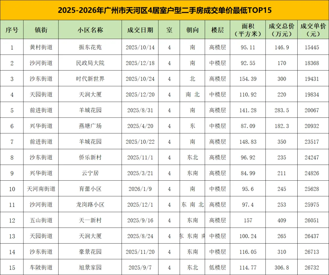 2025年以来,广州市天河区4居室户型成交单价最低的15套二手房,呈现出区域分散、小区多元、价格分化的特征,面积跨度较大,成交总价较为分散,单价区间在1.5-2.7万元/㎡,覆盖天河东、北、中片区,反映天河作为核心区,各片区均有刚需/改善型4居的低价选择。