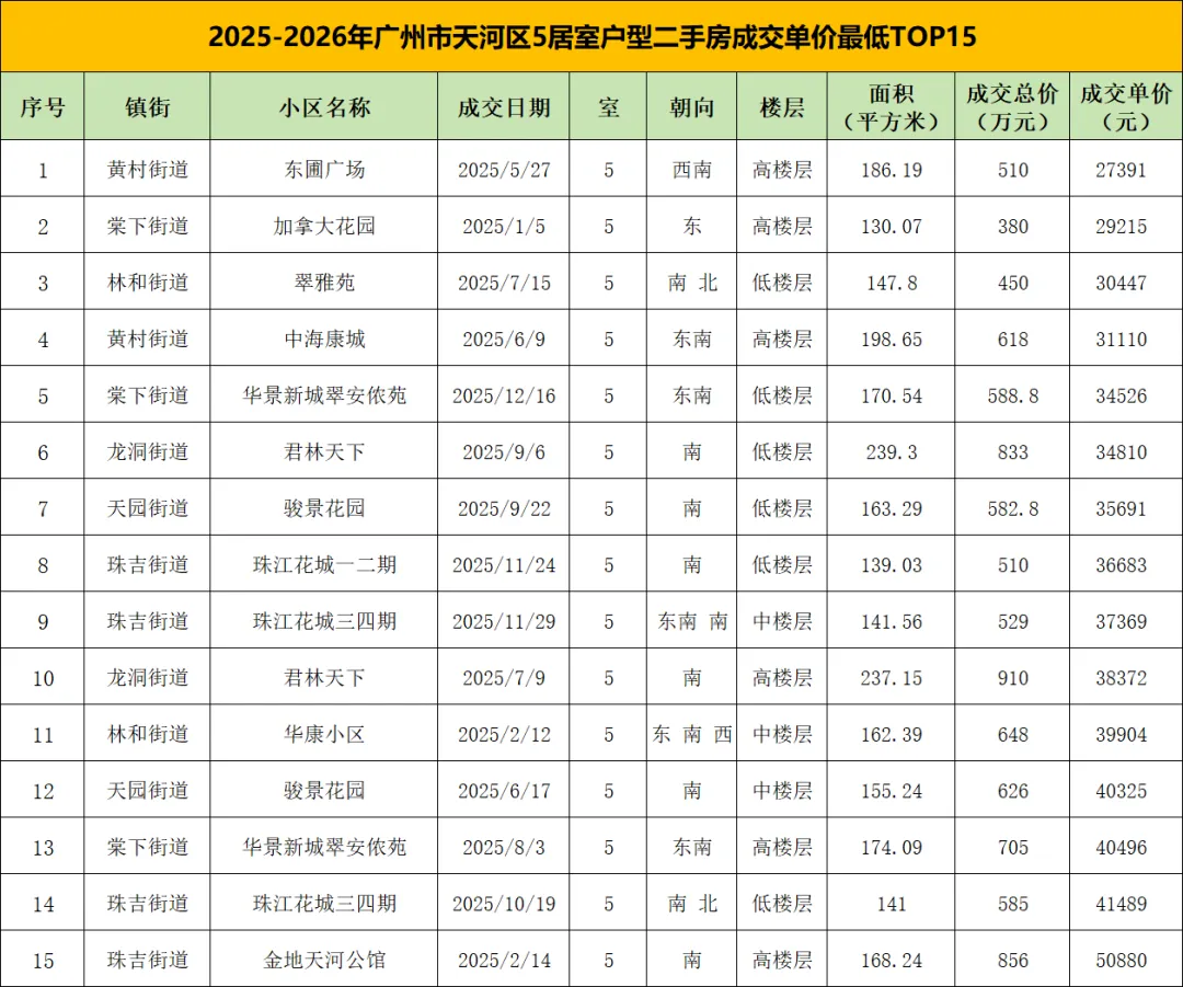 2025年以来,广州市天河区5居室户型成交单价最低的15套二手房,呈现出高端改善型住房的低价选择逻辑,面积多在140-200㎡,成交总价较为分散,单价区间在2.7-5.1万元/㎡,覆盖天河东西北及中部片区,反映天河作为核心区,各片区均有高端5居的“捡漏”机会。