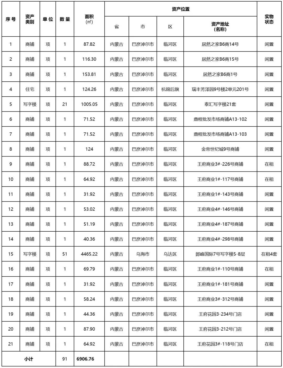 项目推介丨【房产转让】内蒙古巴彦淖尔市等地91处商铺办公转让,资产类型丰富,可单套或分包处置!