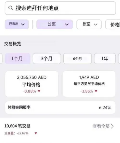 但每经记者从阿联酋头部房产数据与市场情报平台property monitor获取的数据显示,迪拜过去一个月(2月16日—3月17日)公寓的成交笔数为10604笔,同比下滑22.67%。公寓的平均价格为2055730 AED(阿联酋迪拉姆,下同)/套(约合人民币385.6万元/套),同比下跌0.88%;每平方英尺平均价格为1949 AED(约合人民币3.94万元/平方米),同比下滑3.53%。