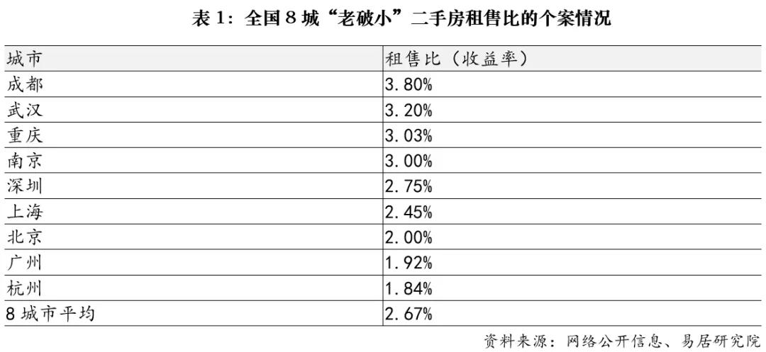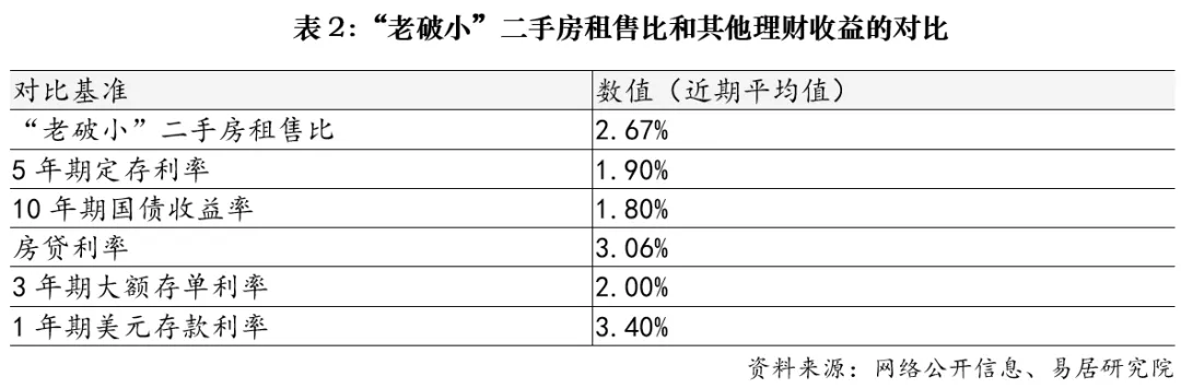 当前“老破小”行情的核心逻辑,是资产定价向“现金流”的回归。在低利率环境下,租售比是否能够覆盖资金成本、是否优于其他理财产品,成为衡量投资价值的重要标尺。以下为重点城市“老破小”租售比与理财产品收益率的对比表。需说明的是,相关数据均为个案,具体租售比需结合不同小区实际情况分析。部分城市如成都曾出现7.4%的个案,属于个别现象。本报告中租售比的公式为:租售比=(月租金×12)/房屋总价。整体来看,租售比已跑赢存款利率,也逐渐接近房贷利率。8个城市平均租售比为2.67%,明显高于1.9%的5年期定存利率、1.8%的10年期国债收益率以及2.0%的3年期大额存单利率。同时,与3.06%的房贷利率相比,也已基本持平。考虑到部分城市房贷利率已低于3%,这意味着在按揭贷款的情况下,租金收入已基本能够覆盖月供。对于偏好人民币资产、看重区位价值的投资者而言,老破小已具备一定的类固收属性。