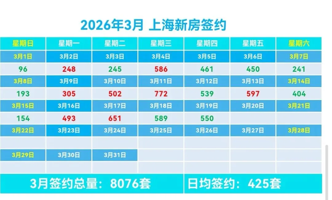 🏠3月上海新房总签约8076套,日均签约425套,本月签约总面积64.8万m²,套均面积79.27m²。