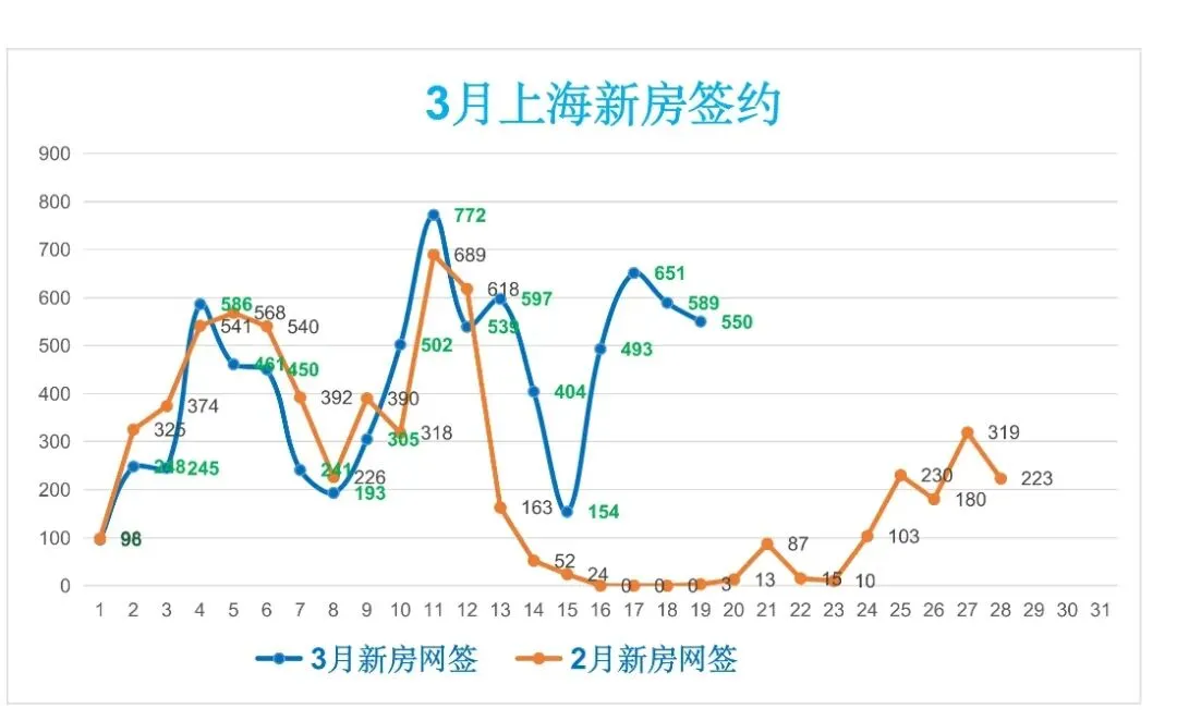 🏠昨日(3月19日,周四),上海新房签约550套,较前一日减少39套(降幅6.62%),日签约面积4.5万m²,套均面积81.82m²。