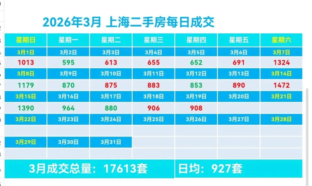 🏡3月,上海二手房成交量累计17613套,日均成交927套,较上个月日均增加523套(增幅129.46%)。