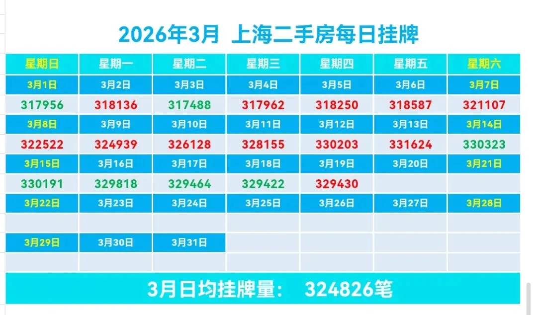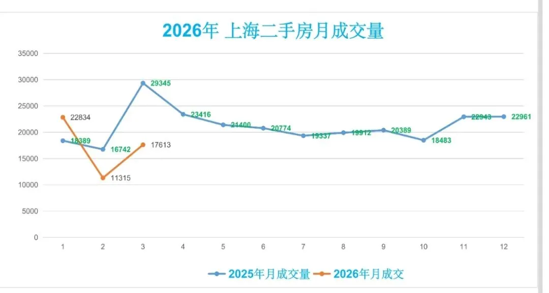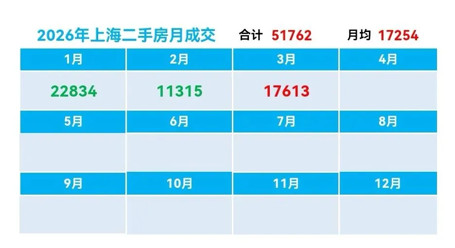 ♻️截止2026年3月19日,2026年上海二手房成交量合计51762套,月均21174套。