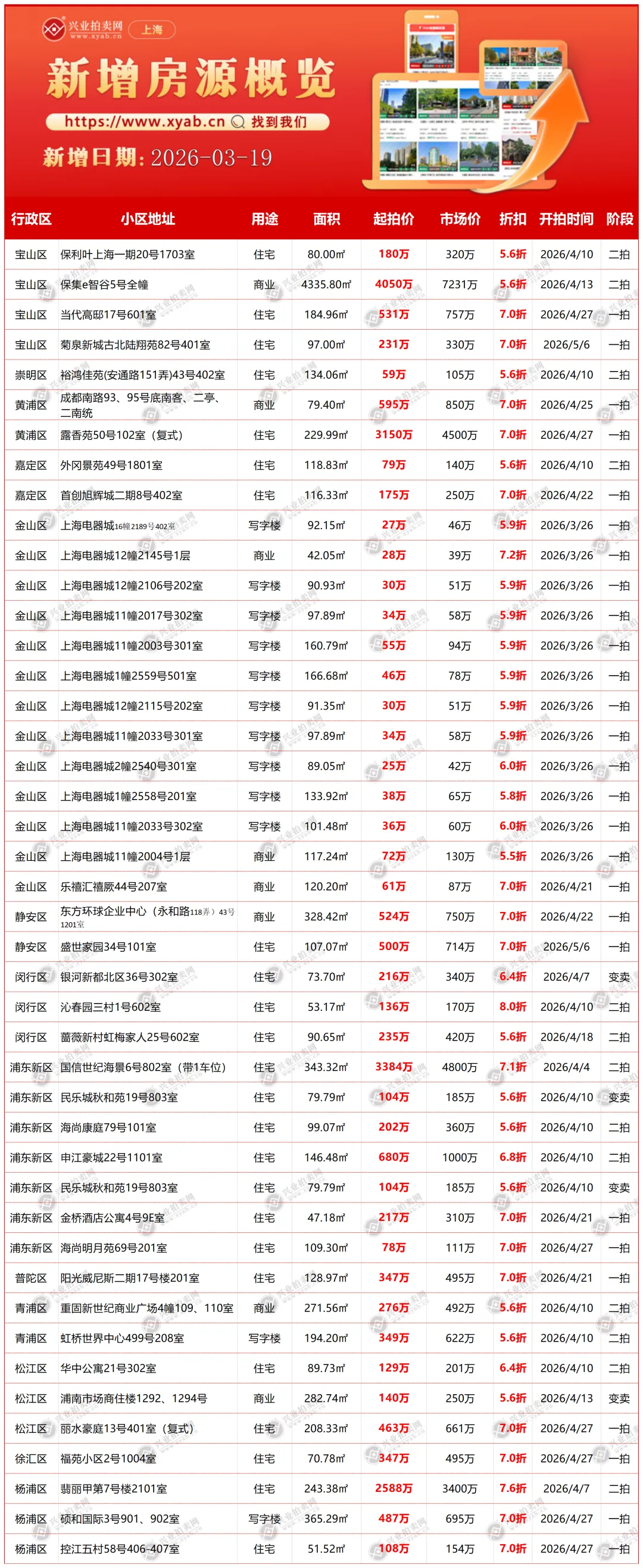 上海拍卖房产昨日新增详情