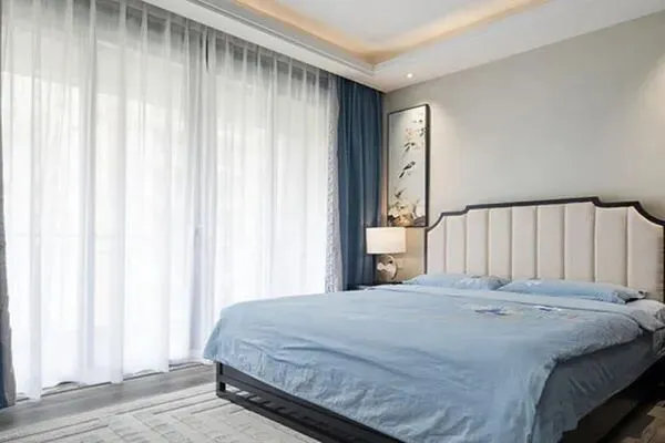 继续探索着,来到了卧室空间。这间卧室的面积适中,而设计师Fred在此,承袭了家孔雀蓝的色调,将其一以贯之。一张简约的大床,温雅的床头装饰,与淡雅的窗帘,一并勾勒出了细韵绵长的气质来。床上的优质床品,让Agnes的每一夜都似乎被一双温柔手臂所包裹着,这也让睡眠变得至臻有趣,舒适尔雅了。在这一派风月的卧室里,空间彷如是兼收并蓄了,让人暂别了城市的喧闹,在优雅从容之间,倍感舒缓了。这间卧室,它不用怀疑,是家静谧典雅的空间,也续写了家的温雅底气了。