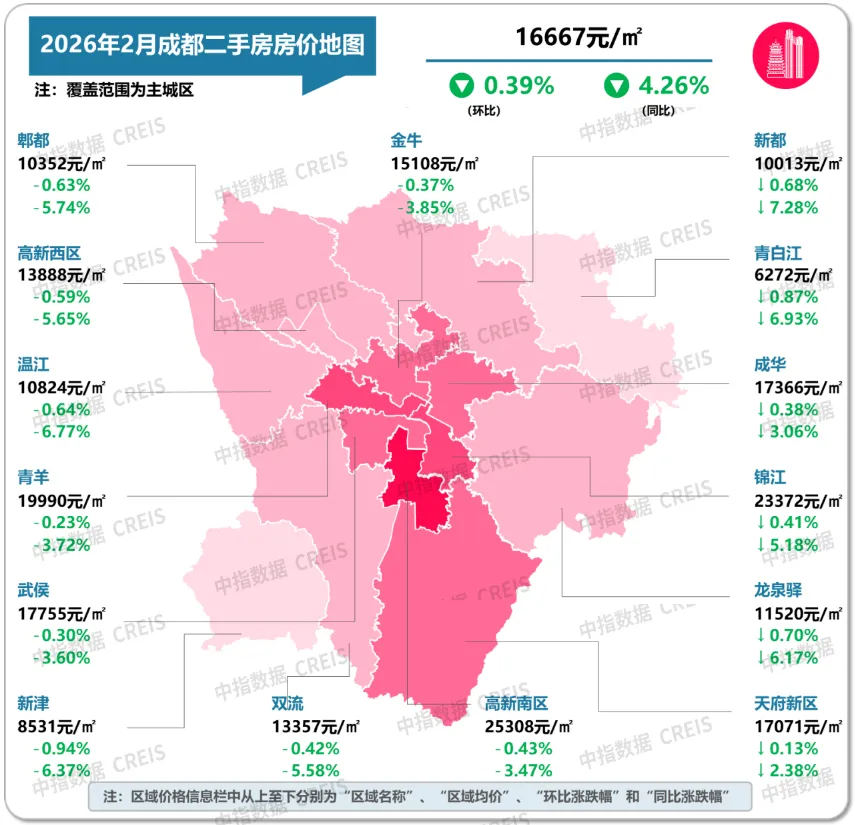 图:2026年2月成都各市辖区二手住宅挂牌均价及同环比