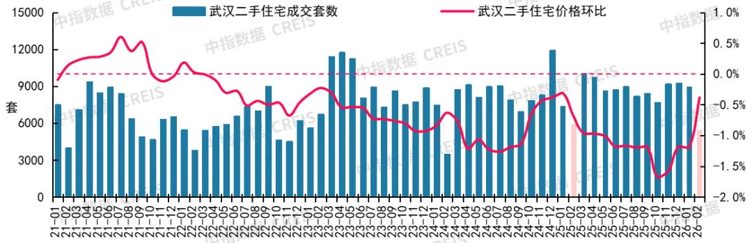图:2021年1月至2026年2月武汉二手住宅成交套数及二手住宅价格环比走势