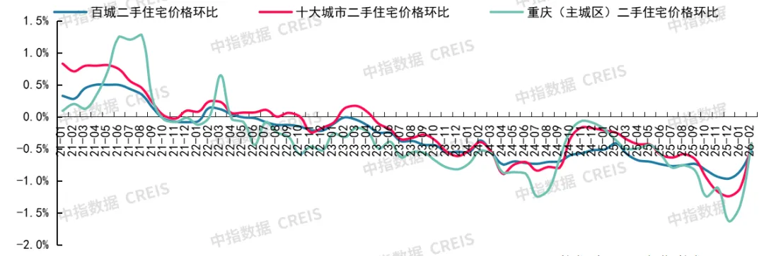 图:2021年1月至2026年2月重庆(主城区)二手住宅成交套数及二手住宅价格环比走势