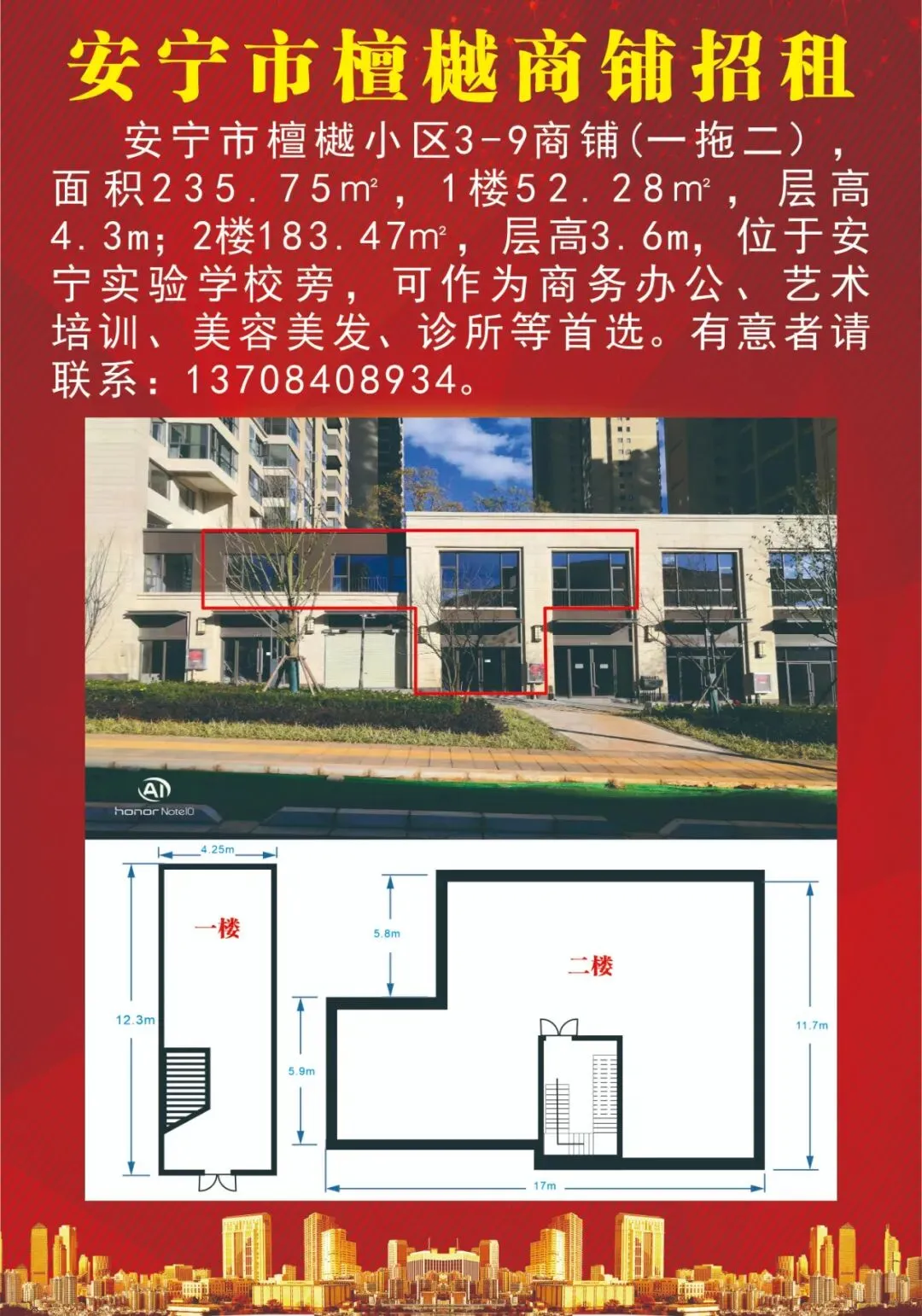 因店主改行做其它行业,把正在赢利的铺面转让,铺面适合做餐饮。地址安宁市云南理工职业学院商业街,非诚勿扰。电话:13688778123 15987942286现有金色城邦一套房屋对外出租,面积:约90平米左右,地理位置佳,生活交通方便,附近有学校,农贸市场,超市等,带家具,拎包入住,价格从优,有意者电话联系!现有位于安宁凤城春色中通快递驿站需对外转让,店铺经营正常,盈利可观,由于个人原因无暇经营,割爱转让,附近有安宁一中,幼儿园,酒店,农贸市场等多个成熟小区,地理位置佳,客源稳定,设备齐全,接手即可经营,有意者可电话联系 ,价格从优!本酒店位于安宁大学城富安村及金湖盛景,地理位置优越,客源稳定。因有其他项目发展,无人管理特转让,安宁大学城富安村酒店有套房28间,金湖盛景酒店有40间,有布草间、消毒间 ,5证齐全,全新高档装修,价格面议,非诚勿扰!世贸广场商铺出租出售