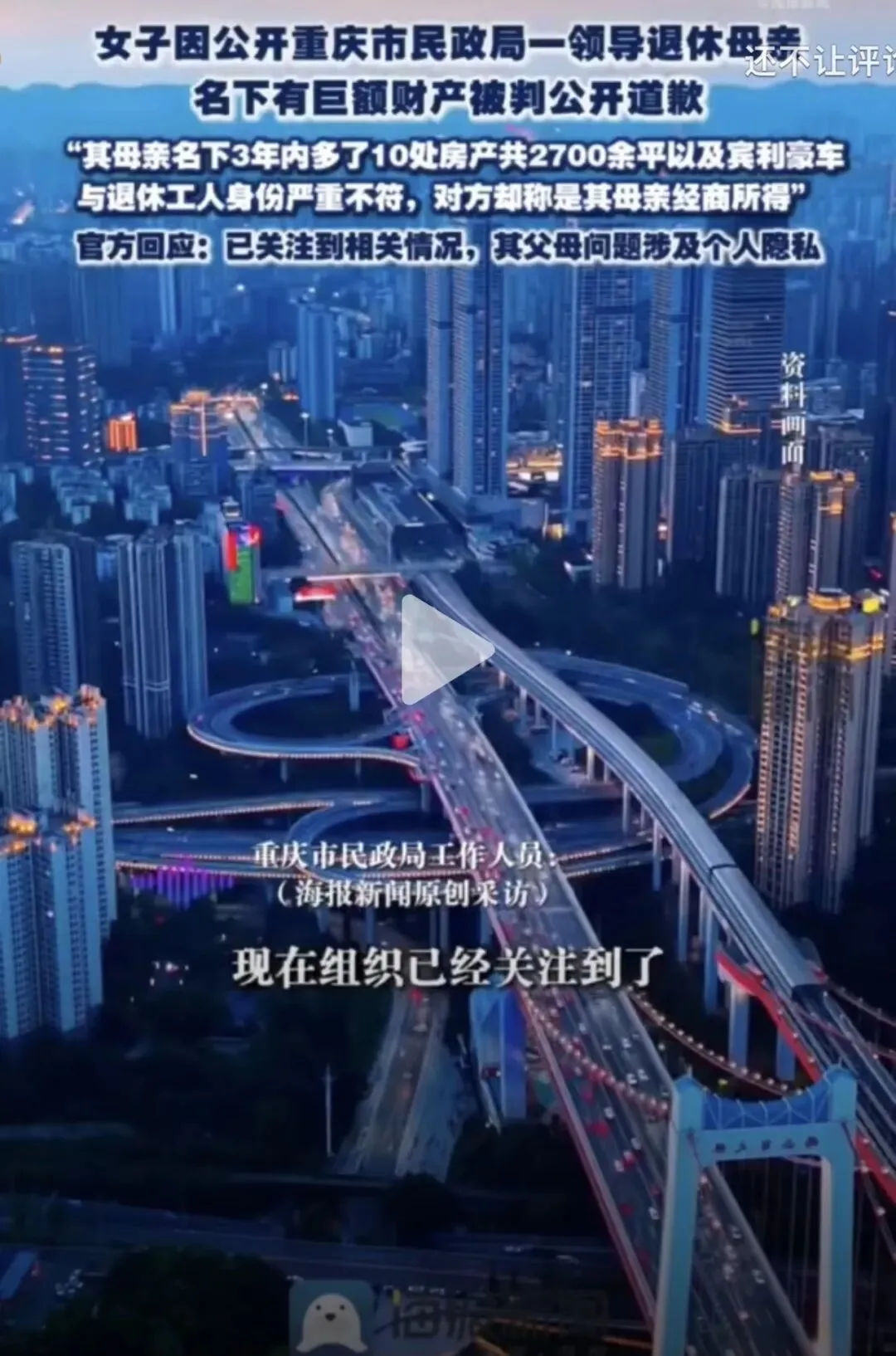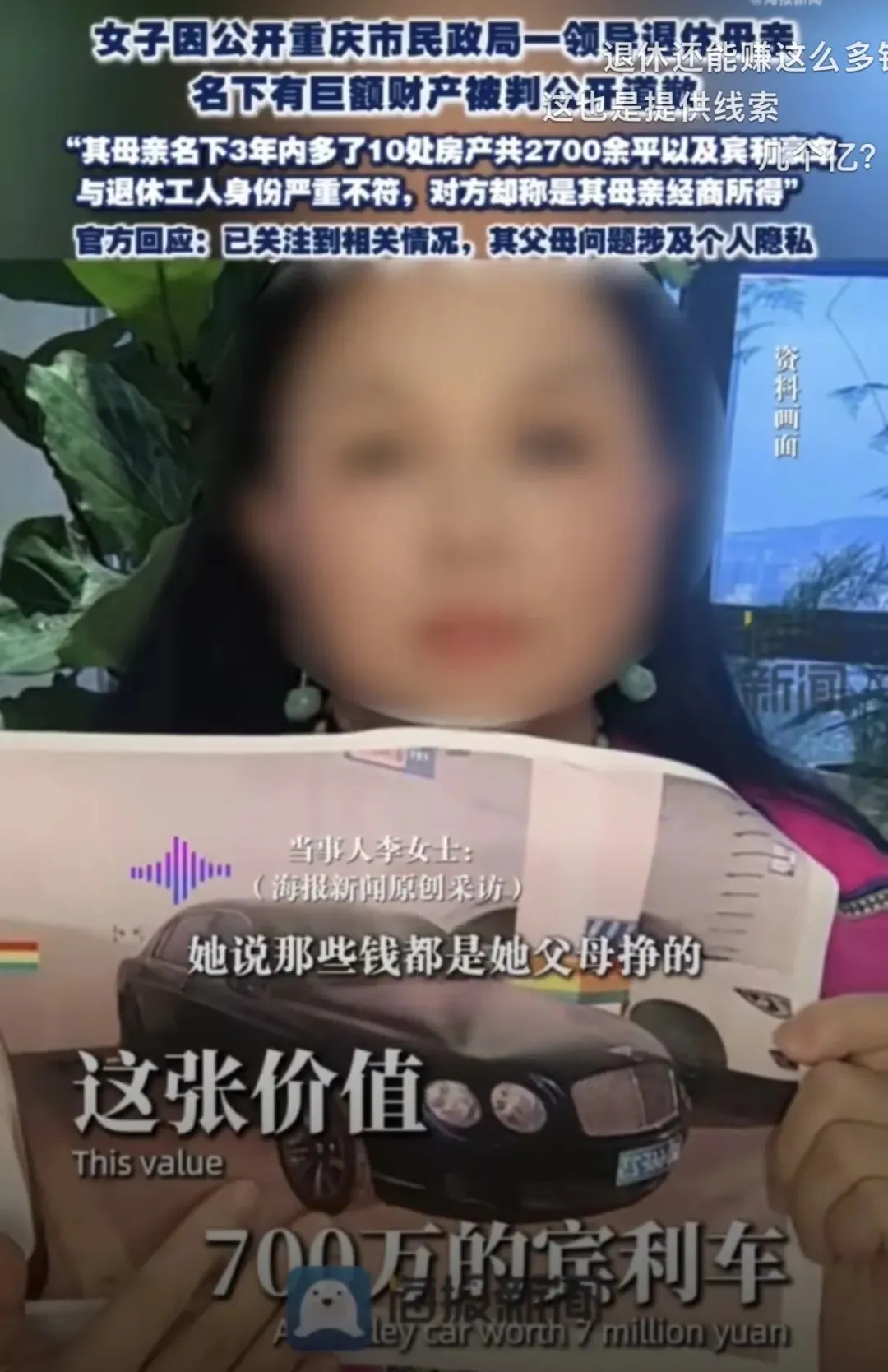 近日,潇湘晨报报道,一女子网上公开举报:重庆市民政局某领导的退休母亲,短短三年内名下新增房产10处、总面积达 2700余平方米,估值数额巨大,另有豪车,财产状况与其退休工人身份严重不符。