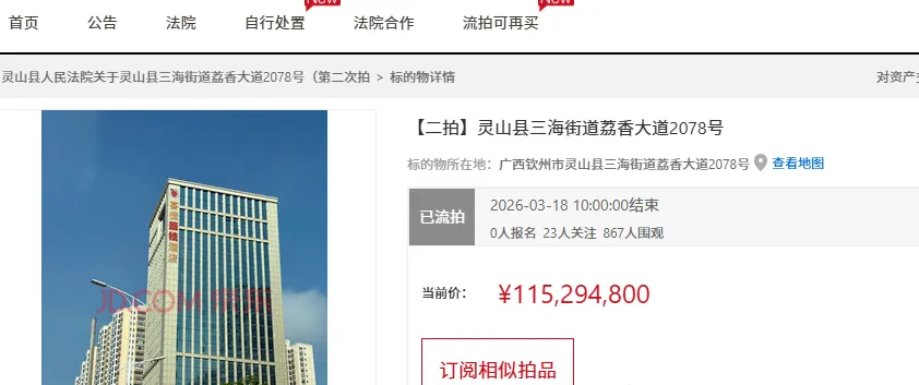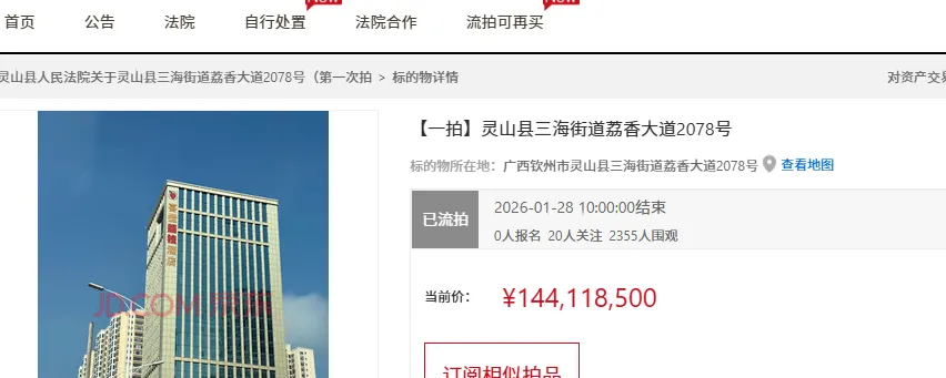 这次拍卖是在灵山县人民法院京东网司法拍卖平台上进行的。第一次拍卖在2026年1月27日到1月28日就开展了,当时评估价格高达1.441185亿元,起拍价也是这个数。可惜啊,这么高的价格让不少人望而却步,最终无人报名,第一次拍卖就这么流拍了。