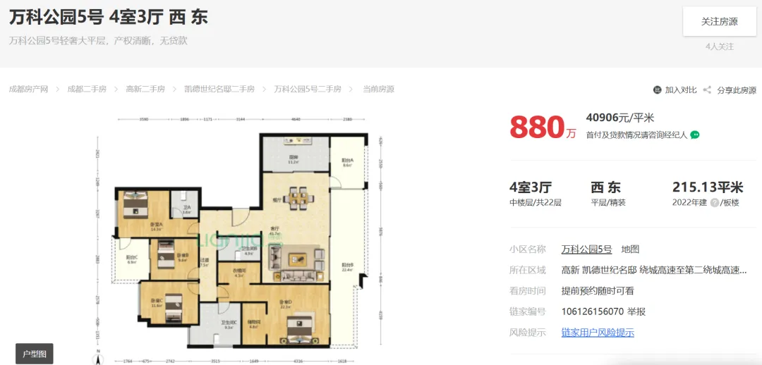 2026年03月16日,【那坊归心】成都高新大源存量房(二手房)万科公园5号二期建面215平套四报价880万,是否适合90后?
