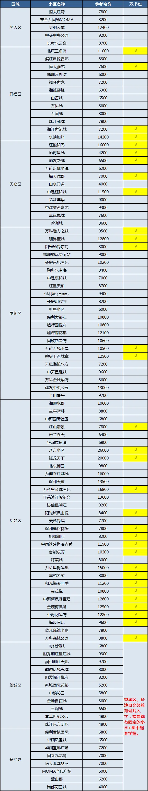 除望城、长沙县外,有32个小区配套“双书包”,马上就到4月初报名季了,学区二手房市场火热,而家长们偏爱双书包小区,不用参与微机派位,一站式稳定教育。像江悦和鸣、中建钰和城、德奥上河城章、万科森林公园等更是兼顾“次新”和“双书包”两大特点。