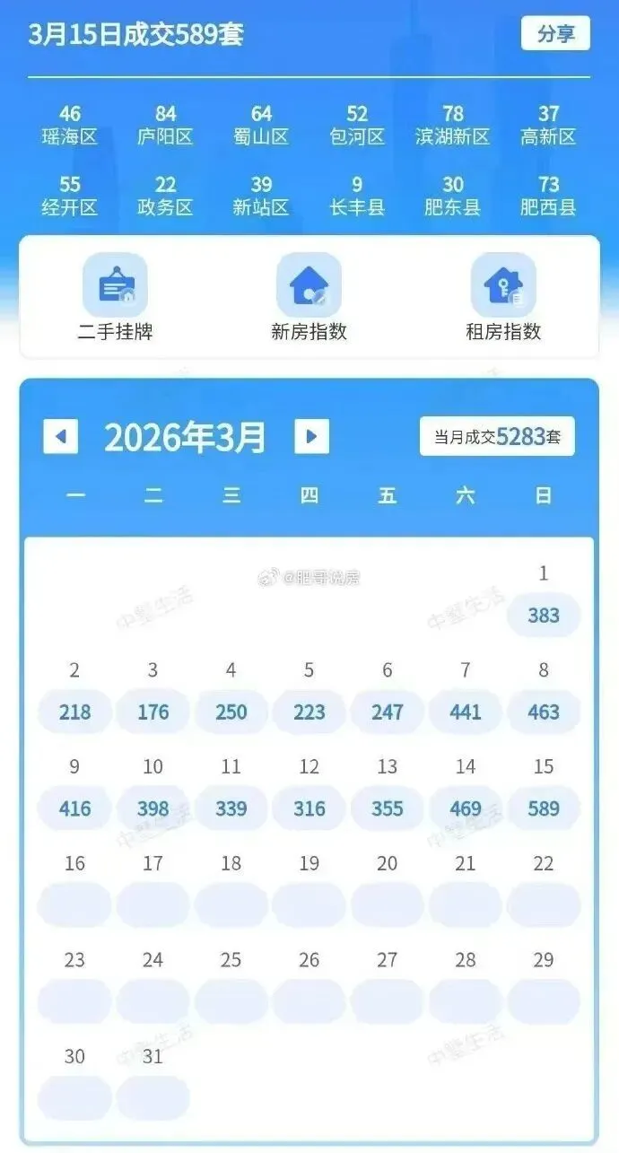 先看一组最直观的数据。截至2026年3月15日,合肥1-3月二手房成交15660套,同比上涨19%。