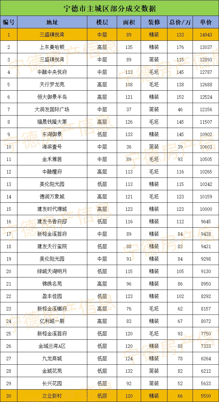 小编收集到的宁德主城区已成交的部分二手房数据,总数据具体如下: