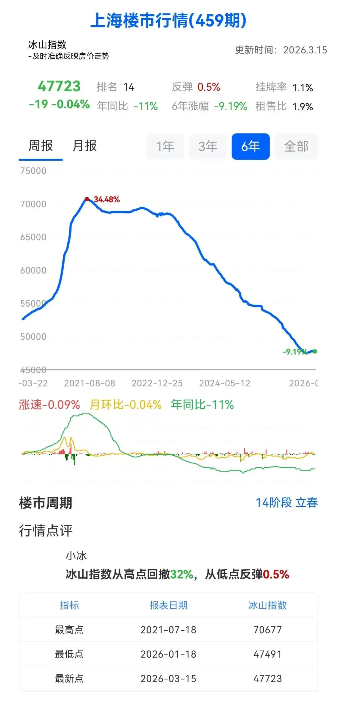 根据2026年3月15日的最新冰山指数,上海房价指数目前定格在47723。对比图中两条曲线,我们可以清晰地看到市场的分化与走势: