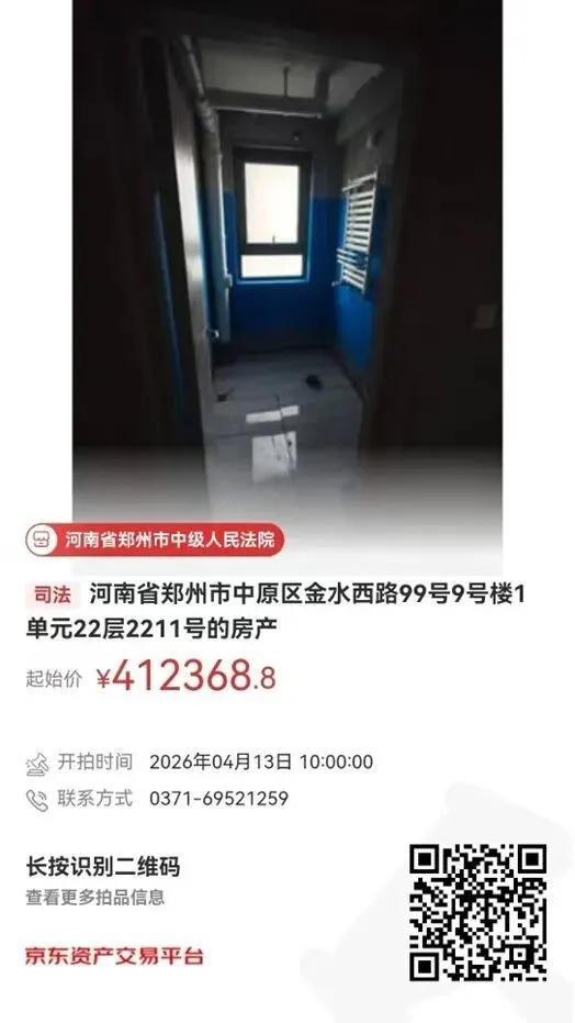 河南省郑州市中级人民法院将于2026年4月13日10时起至2026年4月14日10时止(延时除外)对位于河南省郑州市中原区金水西路99号9号楼1单元22层2211号的房产进行公开拍卖活动,意向投资人可通过以下方式查看详情并参与竞拍。