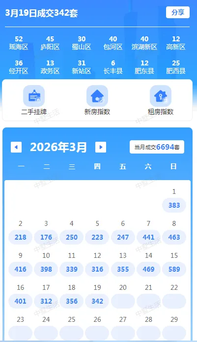 当时间踏入2026年3月,合肥二手房市场的温度计,指针剧烈地摆动起来。与1月的平稳、2月春节的“冰封”截然不同,3月的合肥二手房市场,在周末频频爆出单日数百套的成交高峰,犹如投入平静湖面的石子,激起了层层涟漪。