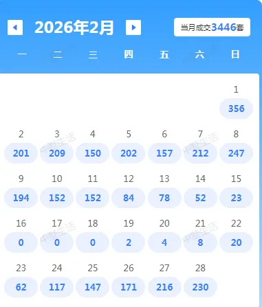 2月受春节假期影响,2月成交总量骤降至3446套,几乎是1月的一半。特别是春节当周(2月9日-15日),成交量甚至出现个位数和零成交的“冰点”。节后市场缓慢复苏,但直到月底,成交量才逐步爬升到200套以上。