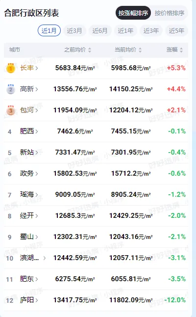 涨幅榜上,长丰县以+5.3%的涨幅领跑全市,当前均价5985.68元/㎡。高新区紧随其后,上涨4.4%,均价达到14150.25元/㎡。包河区则以2.1%的涨幅位列第三。然而,另一面是部分核心区域的回调。庐阳区跌幅最为显著,达-12.0%,均价从13417.75元/㎡降至11802.09元/㎡。滨湖新区下跌3.1%,蜀山区和经开区分别下跌2.1%和2.0%。