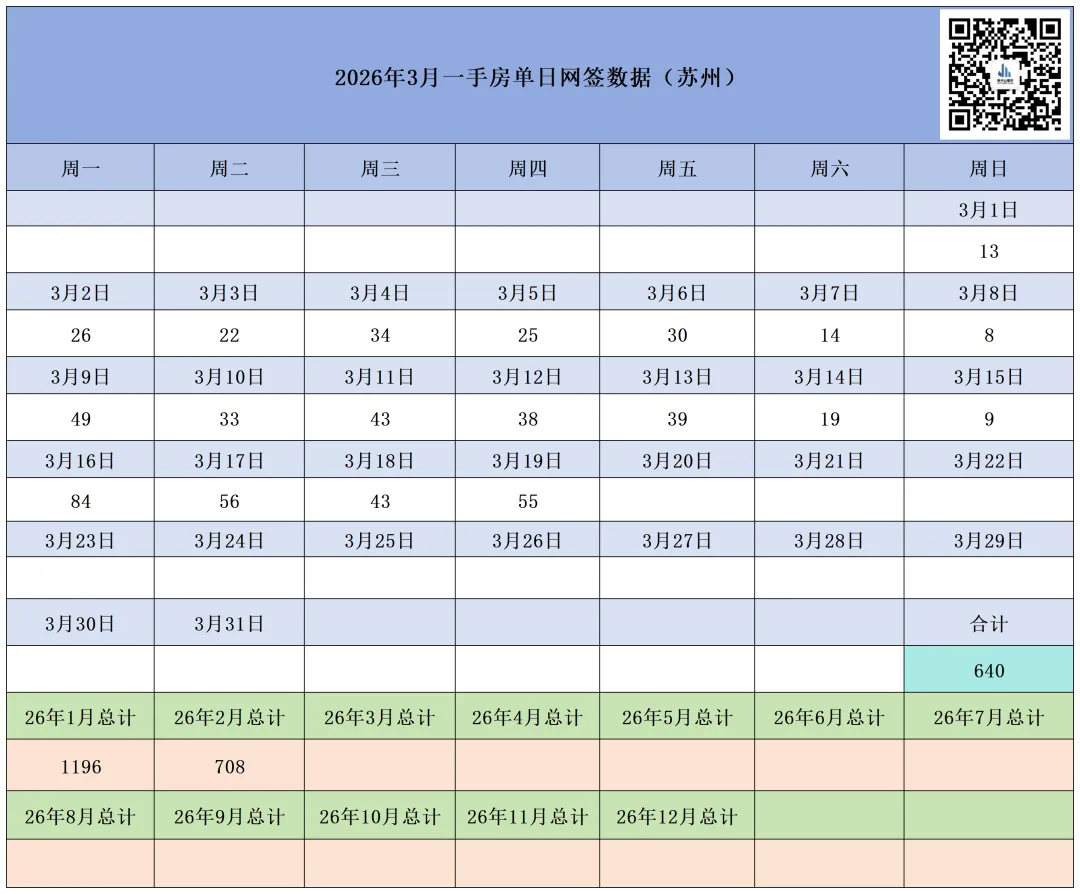 本月截至3月19日(周四),苏州六区住宅累计网签【3289套】,其中二手房累计网签【2649套】、新房累计网签【640套】。