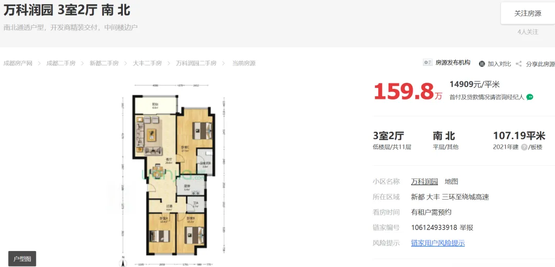 2026年03月19日,据市场端消息:成都新都大丰,万科润园建面107平套三报价160万;目前房东心里价在160万愿意出售。