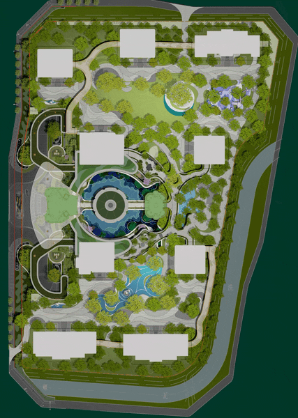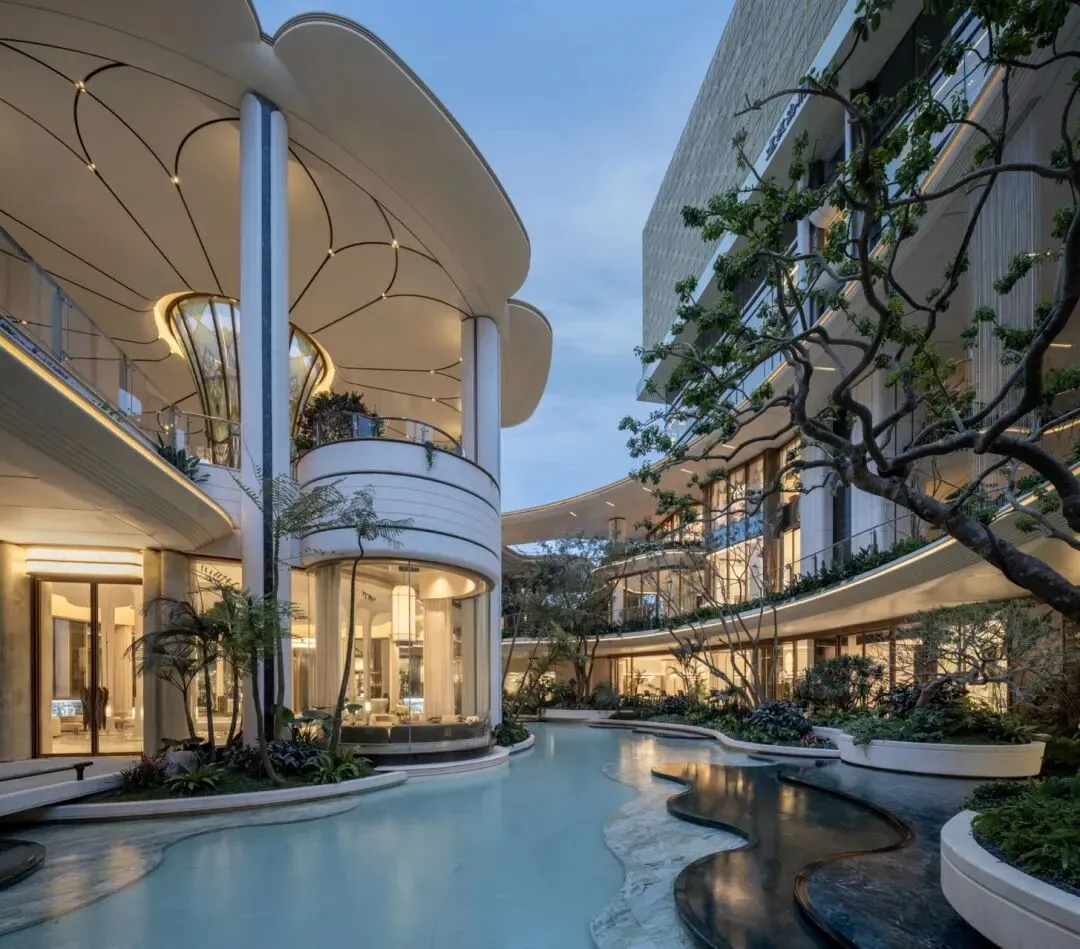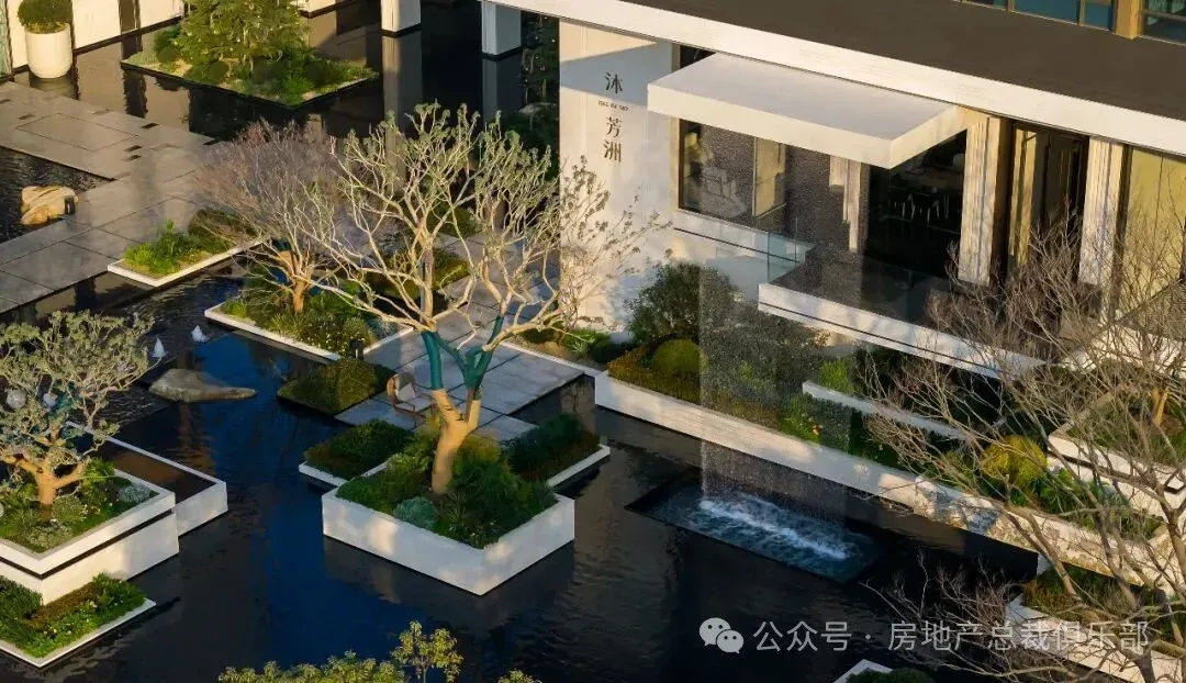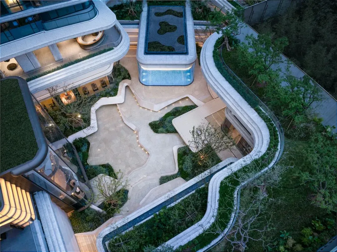 项目位于杭州未科板块,全抬板社区,元序通过五重景观环岛,将园区整体抬升约5米,2楼相当于普通住宅4楼,架空层最高达约6.3米。得益于此,业主可穿梭于三层立体式景观水院,超2500㎡景观水系之中,层叠错落间,仿佛行走于“悬浮于城上空的绿洲”。