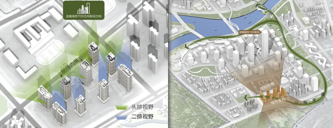 建发·海耀所在的这块方正而完整的土地,拥有金融城三期河东八块住宅用地中,最宽的向心视野:南北向约232米的尺度展开,前方为七中育才,几乎无遮挡,使得大多数楼栋能够东向直面"双塔"、银泰中心、JFC,以及未来的金融城东TOD建筑群。